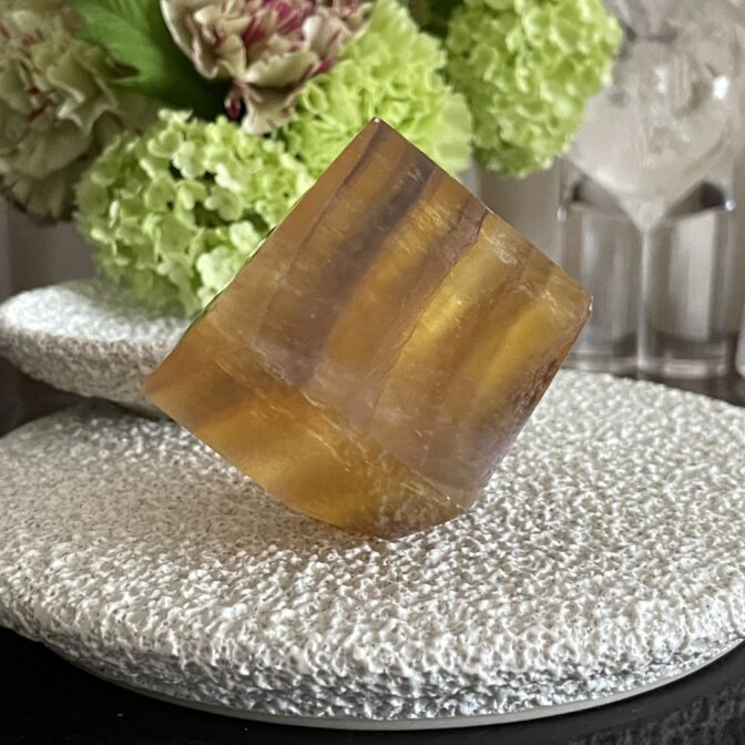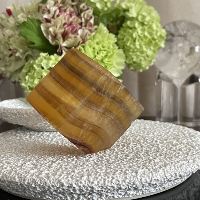 この商品を手にとるには、長い歴史を持つ世界中の鉱物から厳選された最高品質のフローライトを使用しております。特別な加工工程を経てこの美しいキューブが出来上がりました。