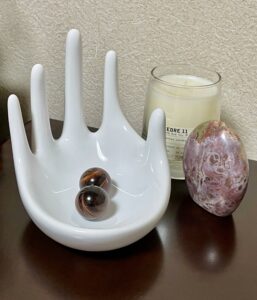 父の日が近づいていますね。天然石をぜひ父の日にプレゼントされてはいかがでしょうか。写真の白い手の器に入っているスフィア(球)はレッドタイガーアイです。パワーストーンと聞いて、思いつく人気の天然石のひとつはタイガーアイではないでしょうか。タイガーアイは神秘的な縞状の模様で、迫力のある「虎の目」という名前から男性に人気のある石です。