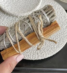 水晶クラスター、ホワイトセージ・パロサントのセット、クリスタルチューナーです。いずれも、ホワイトセージ・パロサントは天然石はもちろんのこと、空間も浄化してくれます。ここでパロサントの名前が出てきたのでお話しさせていただきます。パロサントはスペイン語で「聖なる木」を意味し、南米の一部で育つ神聖な木です。何年にもわたってスピリチュアルな修行やエネルギーの浄化に使われてきました。このスティックに火をつけるとストレス状態が緩和され、平和なエネルギーが流れ込むようにするために使用するのです。パロサントに火をつけ、約30秒間燃やしたあと、息を吹きかけ空間をクリアにします。RHODONで販売しているパロサントはペルー産になります。現在は伐採禁止のため、自然に倒れた木を使っています。