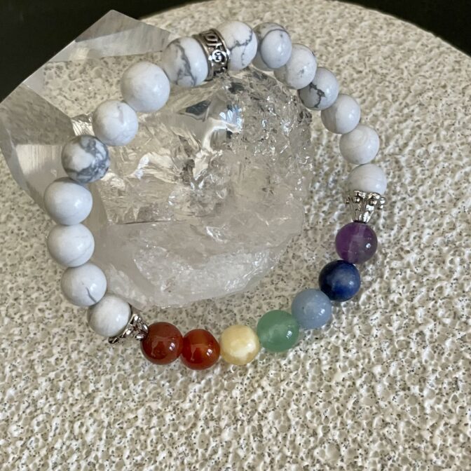 このブレスレットは、タイガーアイ、カーネリアン、グリーンアベンチュリン、ソーダライト、アメジスト、クリアクォーツ、ヘマタイト、ハウライト8色の天然石が縁取られたハウライトのビーズで作られています。それぞれの色は、チャクラと呼ばれる体内にあるエネルギーセンターに対応しています。それぞれのチャクラは、私たちの健康や感情、シーズン性とも関連しているとされています。