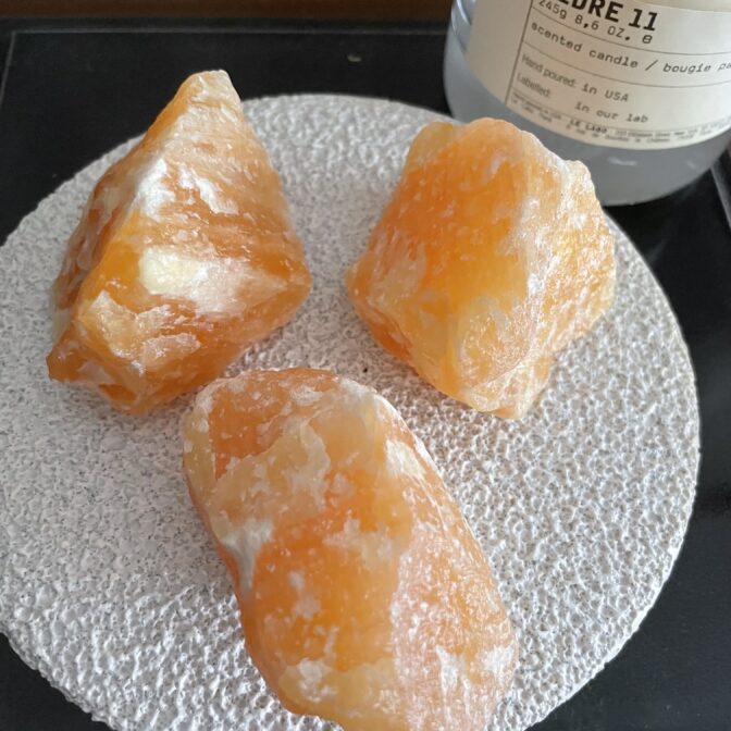オレンジカルサイトのラフカットは、鮮やかなオレンジ色が特徴的なカルサイト石です。1つ1つ手作業で削られるため、75-100gの自然な形状となっています。