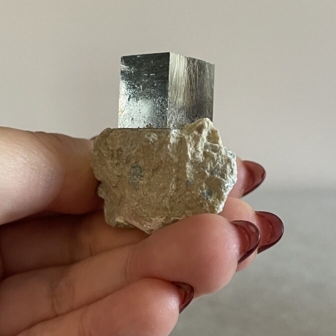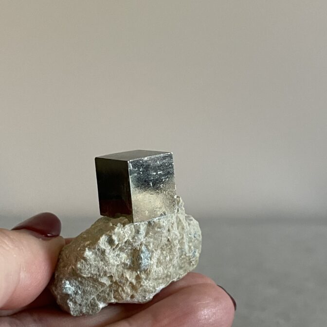 美しい結晶が魅力のスペイン産ミニ パイライト キューブ オン マトリックス。母石がついたミニパイライトは、自然の神秘を感じさせる存在感があります。