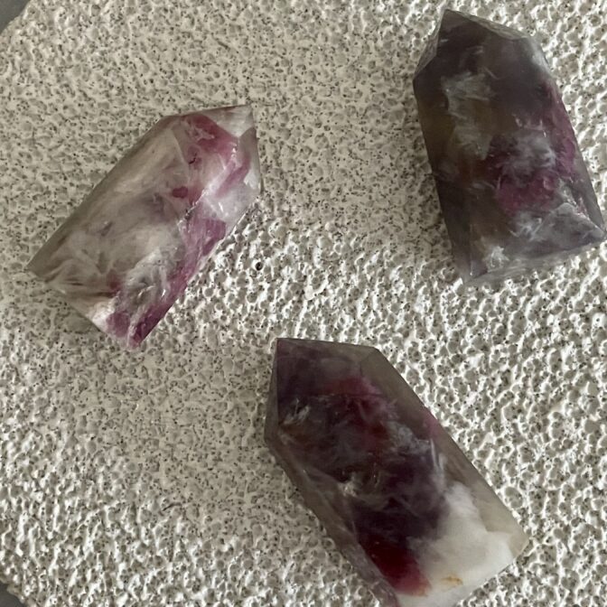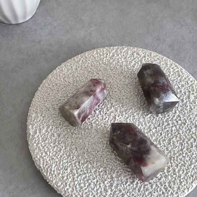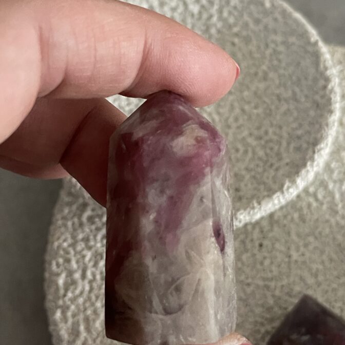 ユニコーンクリスタルは、マダガスカル産のレピドライト、クリーブランダイト、ピンクトルマリン、スモーキークォーツ、長石のブレンドです。